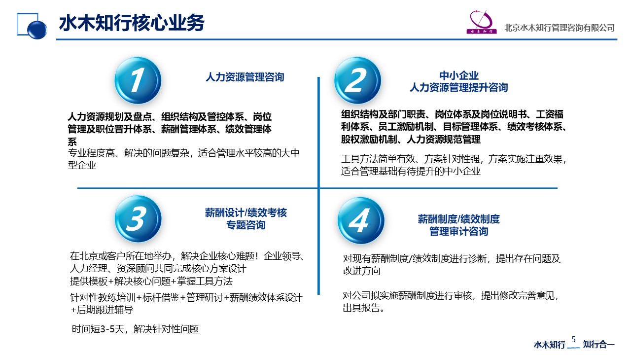 北京水木知行管理咨詢(xún)有限公司(www.www.apevm.com)專(zhuān)注提供人力資源管理咨詢(xún)、人力資源管理培訓(xùn)、人力資源招聘咨詢(xún)、人力資源獵頭服務(wù)業(yè)務(wù);咨詢(xún)業(yè)務(wù)范圍包括組織結(jié)構(gòu)與管控體系、崗位管理體系、薪酬管理體系、績(jī)效管理體系,咨詢(xún)形式包括全過(guò)程咨詢(xún)、教練式咨詢(xún)和特訓(xùn)班;培訓(xùn)業(yè)務(wù)包括企業(yè)基礎(chǔ)管理...[詳情]