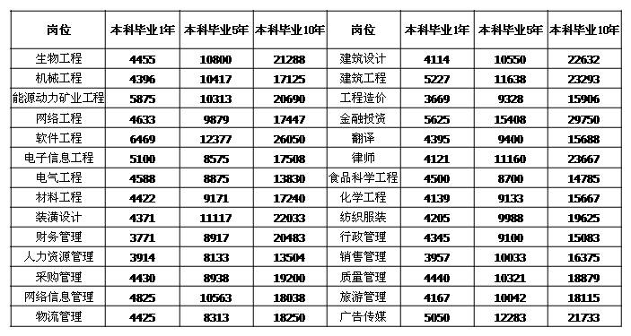 下表是2017年第二季度本科畢業(yè)1年、本科畢業(yè)5年和本科畢業(yè)10年的競爭性薪酬水平: