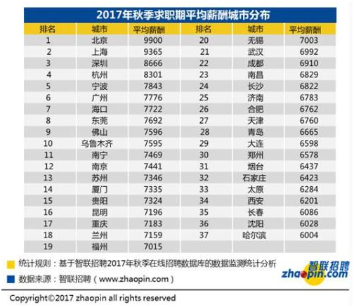 報告顯示,根據(jù)2017年秋季在線數(shù)據(jù)顯示,全國37個主要城市的平均招聘薪酬為7599元,本季度平均薪酬重新回升,環(huán)比上升幅度3%。