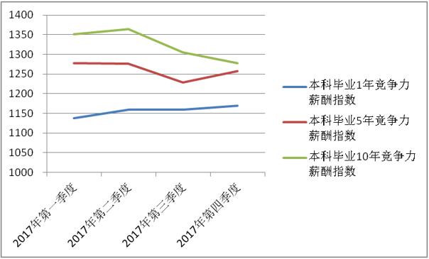 (注:2012年薪酬指數(shù)為1000,當年本科畢業(yè)1年薪酬加權平均數(shù)為3950元,本科畢業(yè)5年薪酬加權平均數(shù)為7940元,本科畢業(yè)10年薪酬加權平均數(shù)為13960元)