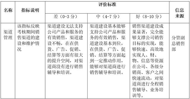 過(guò)程指標(biāo)根據(jù)主要工作流程控制點(diǎn)行為特征來(lái)進(jìn)行描述,以評(píng)估表的形式得出評(píng)價(jià)標(biāo)準(zhǔn)。如“渠道管理”指標(biāo)及其評(píng)價(jià)標(biāo)準(zhǔn)。