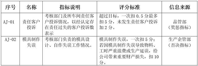 考核的一般不是常規(guī)工作,卻是重要事項(xiàng)。該類指標(biāo)包括否決指標(biāo)、獎(jiǎng)勵(lì)指標(biāo)、獎(jiǎng)懲指標(biāo)。否決指標(biāo)用于對(duì)一些重要提前事項(xiàng)(必須完成的事項(xiàng)或不能發(fā)生的事項(xiàng))的考核,如質(zhì)量事故、安全事故等。獎(jiǎng)懲指標(biāo)用于地某些既要獎(jiǎng)勵(lì)又要懲罰的事項(xiàng)的考核,如責(zé)任客戶投訴次數(shù),員工工傷等指標(biāo)。