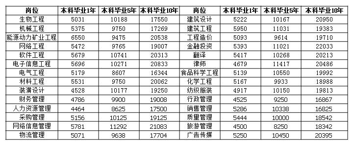下表是2020年第一季度本科畢業(yè)1年、本科畢業(yè)5年和本科畢業(yè)10年的競爭性薪酬水平:
