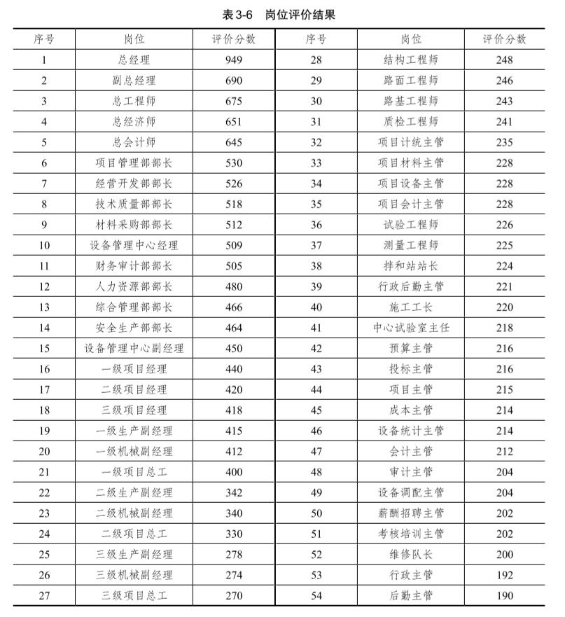公司崗位分為職能管理、項(xiàng)目管理、技術(shù)工人和操作工人幾個序列;職能管理分為總經(jīng)理、副總經(jīng)理(三總師)、部長、副部長、主管及普通管理人員等幾個層級;項(xiàng)目管理分為項(xiàng)目經(jīng)理、項(xiàng)目副經(jīng)理(項(xiàng)目總工)、項(xiàng)目主管級和普通員工等幾個層級。2.崗位評價結(jié)果