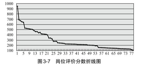 (1)公司崗位評價分布圖將各個崗位評價分?jǐn)?shù)由高到低作出折線圖(見圖 3-7),由圖可以看出,開始分?jǐn)?shù)降