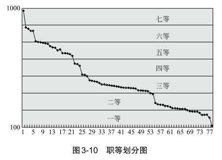 根據(jù)對數(shù)形式的崗位評價分布折線圖的突變特點(diǎn),將整個縱坐標(biāo)劃分為若干職等,由圖 3-10可以看出,劃分為 7個職等比較合適。