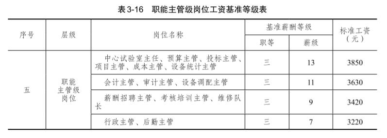 評價分?jǐn)?shù)分布,將職能主管級崗位劃分為 4個層級,職能主管級崗位工資基準(zhǔn)等級如表 3-16所示。