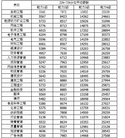 2. 能力等級能力等級體現(xiàn)了各專業(yè)的職業(yè)發(fā)展階梯,是水木知行薪酬數(shù)據(jù)庫建立的主線和基準(zhǔn),不同能力等級意味著不同的薪酬水平。 能力等級的劃分是對崗位要求的綜合判斷,通過對公司規(guī)模、崗位層級、工作年限、專業(yè)知識和技能、責(zé)任擔(dān)當(dāng)、能力素質(zhì)等多個(gè)方面,對能力等級進(jìn)行識別,可以劃分為以下五個(gè)等級:能力1級(初學(xué)者)能力2級(有經(jīng)驗(yàn)者)能力3級(經(jīng)驗(yàn)豐富者)能力4級(專家、大中型企業(yè)中層管理者、中小企業(yè)高層管理者)3. 競爭力薪酬指數(shù)水木知行薪酬指數(shù)包括本科畢業(yè)1年競爭力薪酬指數(shù)、本科畢業(yè)5年競爭力薪酬指數(shù)、本科畢業(yè)10年競爭力薪酬指數(shù)三個(gè)指數(shù);自2013年第一季度開始按季度公布。以2012年第四季度有關(guān)薪酬數(shù)據(jù)為基準(zhǔn),經(jīng)過統(tǒng)計(jì)處理,取基點(diǎn)為1000,2013年后各個(gè)季度指數(shù)等于當(dāng)期薪酬統(tǒng)計(jì)數(shù)據(jù)除以薪酬基準(zhǔn)數(shù);本科畢業(yè)1年薪酬指數(shù)計(jì)算數(shù)據(jù):以各個(gè)崗位能力等級為1級處于25%-75%分位所有樣本平均值為基礎(chǔ),根據(jù)各個(gè)崗位所占權(quán)重,加權(quán)計(jì)算出總的薪酬數(shù)據(jù);畢業(yè)畢業(yè)5年薪酬指數(shù)計(jì)算數(shù)據(jù):以各個(gè)崗位能力等級為2級處于50%-75%分位所有樣本以及能力等級為3級處于25%-75%所有樣本的平均值為基礎(chǔ),根據(jù)各個(gè)崗位所占權(quán)重,加權(quán)計(jì)算出總的薪酬數(shù)據(jù);畢業(yè)畢業(yè)10年薪酬指數(shù)計(jì)算數(shù)據(jù):以各個(gè)崗位能力等級為3級處于50%-75%分位所有樣本以及能力等級為4級處于25%-75%所有樣本的平均值為基礎(chǔ),根據(jù)各個(gè)崗位所占權(quán)重,加權(quán)計(jì)算出總的薪酬數(shù)據(jù);二、 各個(gè)崗位薪酬數(shù)據(jù)1. 各個(gè)崗位不同能力等級25%-75%分位平均薪酬