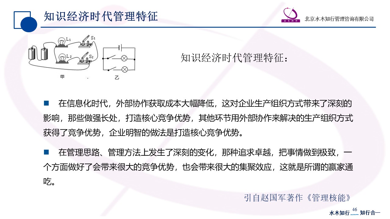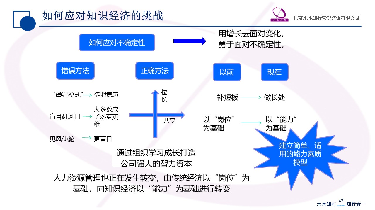 - 企業(yè)如何應對知識經(jīng)濟的挑戰(zhàn)在知識經(jīng)濟,知識傳承很重要,但組織更需要擁抱未來的能力,優(yōu)秀的企業(yè)總是能夠面向未來,提前布局,尋找變化以及未來的機會,用增長去面對變化,勇于面對不確定性。因此如何應對不確定性變得越來越重要,組織的核心競爭力來源在于成長,智力資本對于企業(yè)長期發(fā)展非常關鍵,能夠自我改變是其持續(xù)領先的根本動因。