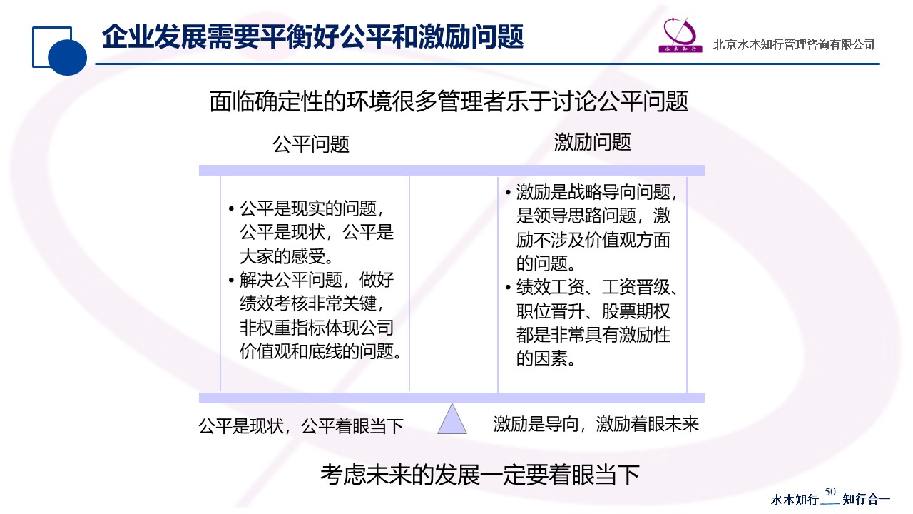 激勵是導(dǎo)向,激勵著眼未來;公平是現(xiàn)狀,公平著眼當(dāng)下;考慮未來的發(fā)展一定要著眼當(dāng)下。