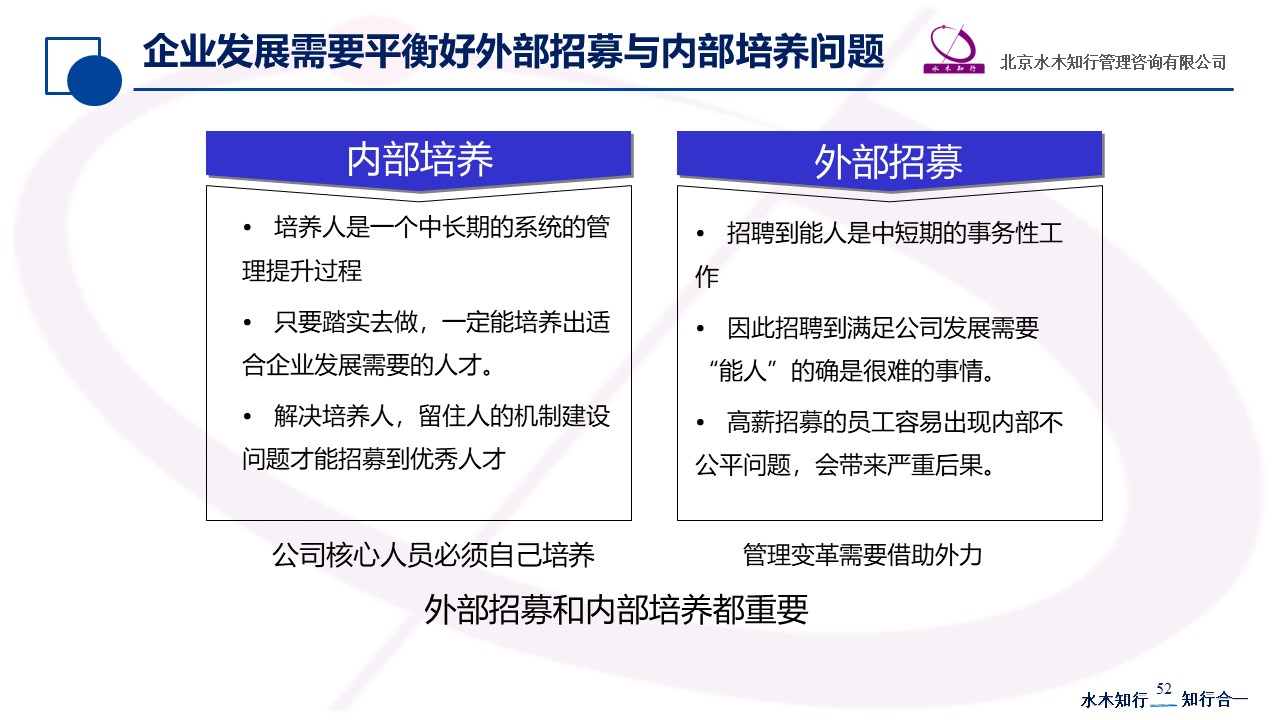 如果企業(yè)規(guī)模比較大,公司發(fā)展已經(jīng)到了成熟階段,公司在行業(yè)內(nèi)有一定地位和影響力,毫無疑問,外部招募和內(nèi)部培養(yǎng)都重要。公司核心業(yè)務(wù)人員必須自己培養(yǎng),只有這樣公司的企業(yè)文化以及核心競(jìng)爭(zhēng)優(yōu)勢(shì)才能延續(xù);企業(yè)發(fā)展了容易故步自封,經(jīng)常受到固有力量的牽絆,因此適度引入外部骨干人員也是非常必要的,尤其在進(jìn)行企業(yè)文化重塑、公司戰(zhàn)略調(diào)整以及管理變革情況下,是非常必要的。