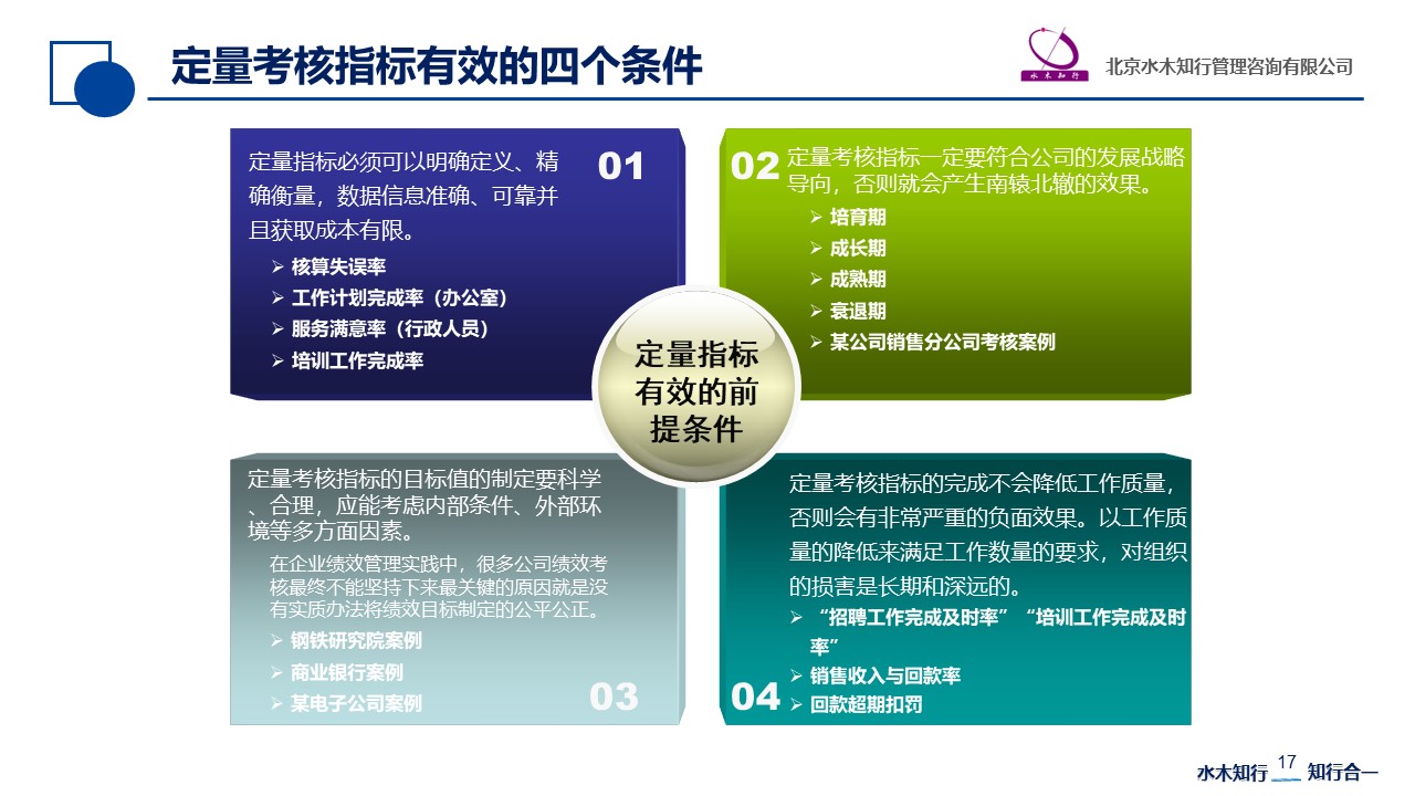 定量指標在績效考核指標體系中占有重要地位,在保證績效考核結(jié)果公正、客觀方面,具有重要作用。但定量指標的運用需要具備一定條件,定量指標考核并不意味著考核結(jié)果必然公正、公平,考核結(jié)果公正、公平不一定需要全部采用定量指標,應該充分尊重直線上級在考核中的主觀評價作用,應該發(fā)揮其他指標在考核中的重要作用。