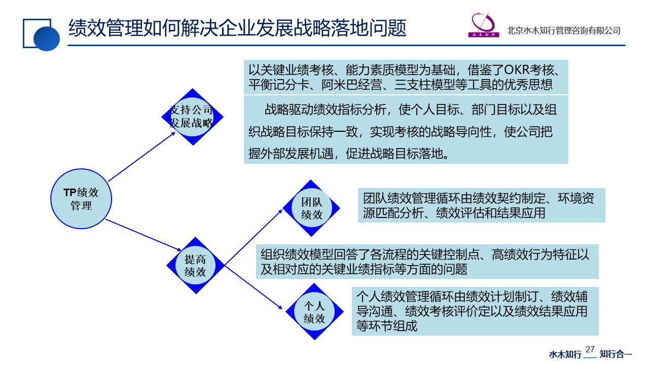 TP績效管理體系站在公司戰(zhàn)略發(fā)展的高度來設(shè)計。以傳統(tǒng)關(guān)鍵業(yè)績考核、能力素質(zhì)模型為基礎(chǔ),借鑒了OKR考核、平衡記分卡、阿米巴經(jīng)營、三支柱模型等工具的優(yōu)秀思想。組織績效模型、能力素質(zhì)模型和滿意度模型為團隊考核、個人考核提供基礎(chǔ)支持。TP績效管理體系通過戰(zhàn)略驅(qū)動績效指標分析,使個人目標、部門目標以及組織戰(zhàn)略目標保持一致,實現(xiàn)考核的戰(zhàn)略導(dǎo)向性,使公司把握外部發(fā)展機遇,促進戰(zhàn)略目標落地。