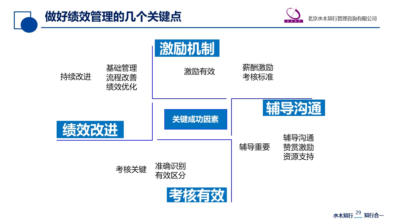 做好績效管理促進(jìn)組織業(yè)績持續(xù)提升需要做好以下幾點:建立激勵機制、重視輔導(dǎo)溝通、保證考核有效、狠抓績效改進(jìn)。