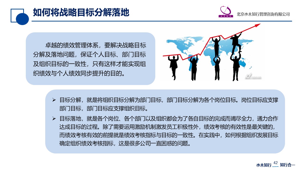 卓越的績效管理體系,要解決戰(zhàn)略目標(biāo)分解及落地問題,保證個人目標(biāo)、部門目標(biāo)及組織目標(biāo)的一致性,只有這樣才能實(shí)現(xiàn)組織績效與個人績效同步提升的目的。