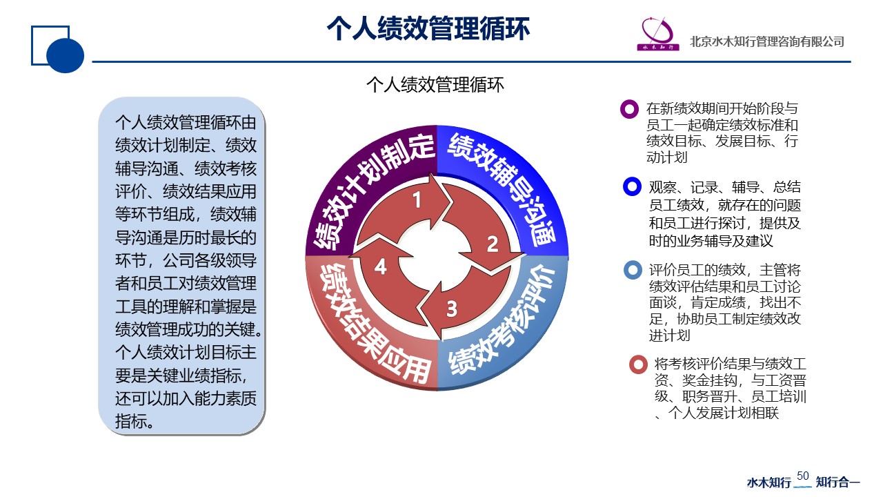 個人績效管理循環(huán)由績效計劃制訂、績效輔導溝通、績效考核評價和績效結(jié)果應用等環(huán)節(jié)組成??冃лo導溝通是歷時最長的環(huán)節(jié),公司各級領導者和員工對績效管理工具的理解與掌握是績效管理成功的關(guān)鍵。個人績效計劃中的績效目標主要是關(guān)鍵業(yè)績指標,也可以加入能力素質(zhì)指標。