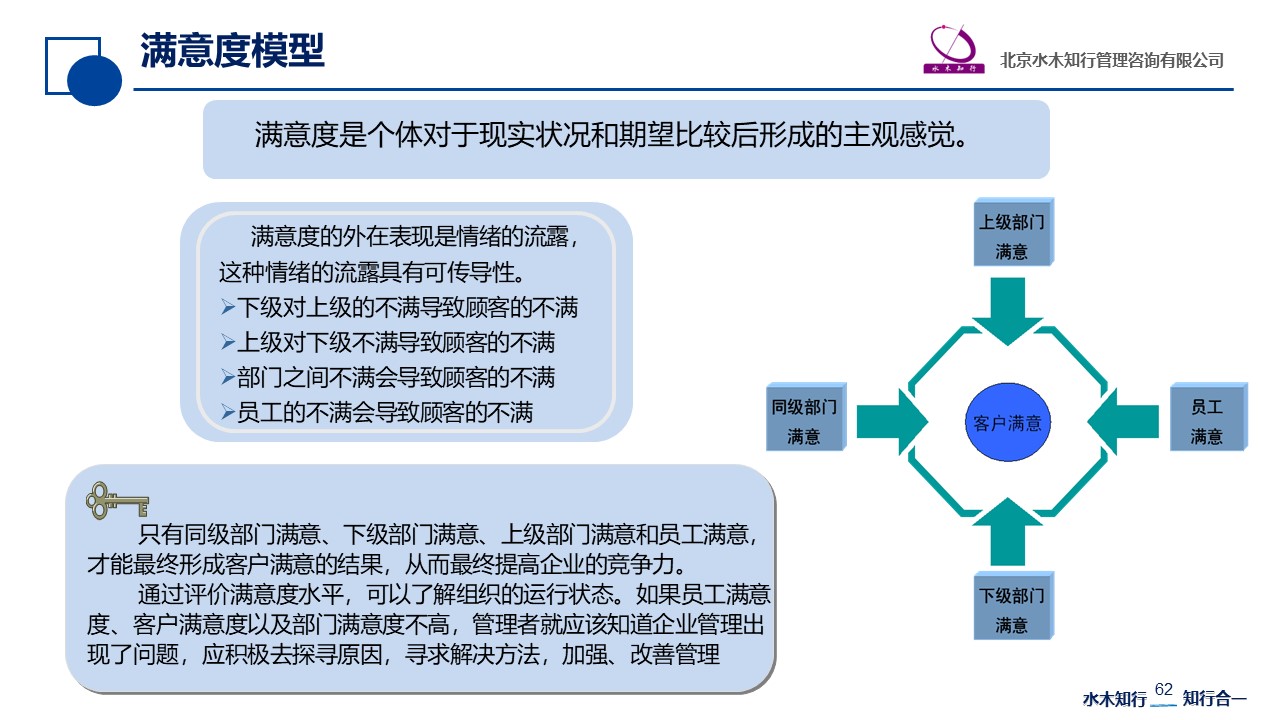 如果上級管理者對于下級員工的滿意度較低,將導致領導對下級的批評;下級會將不滿情緒通過語言和表情動作傳遞給顧客,顧客就會對員工產(chǎn)生不滿意;而較低的客戶滿意度又會影響上級對下屬的滿意度。如此循環(huán)往復,領導、員工、顧客的滿意度都會降低,工作績效就無法提高了;如果部門之間的滿意度不高,會造成扯皮、推諉現(xiàn)象,這樣也會造成顧客的不滿。
