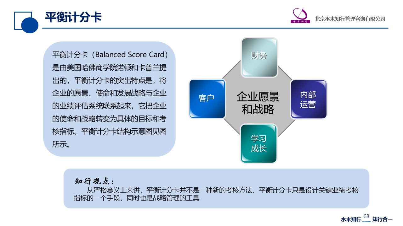 平衡計分卡(Balanced Score Card,簡稱“ BSC”)是由卡普蘭(Robert Kaplan)和諾頓(David Norton)提出的。平衡計分卡一度非常風(fēng)靡,對中國企業(yè)績效管理實踐有深刻的影響。平衡計分卡的突出特點是,將企業(yè)的愿景、使命和發(fā)展戰(zhàn)略與企業(yè)的業(yè)績評估系統(tǒng)聯(lián)系起來,把企業(yè)的使命和戰(zhàn)略轉(zhuǎn)變?yōu)榫唧w的目標(biāo)和考核指標(biāo)。平衡計分卡以企業(yè)的戰(zhàn)略為基礎(chǔ),將各種衡量方法整合為一個有機的整體,既包括了傳統(tǒng)的財務(wù)指標(biāo),又通過客戶、內(nèi)部運營及學(xué)習(xí)成長指標(biāo)來彌補財務(wù)指標(biāo)的不足。平衡計分卡四個方面的提出,站在戰(zhàn)略規(guī)劃、戰(zhàn)略實施角度來看能對各個業(yè)務(wù)單元提出要求,具有較強的指導(dǎo)意義。