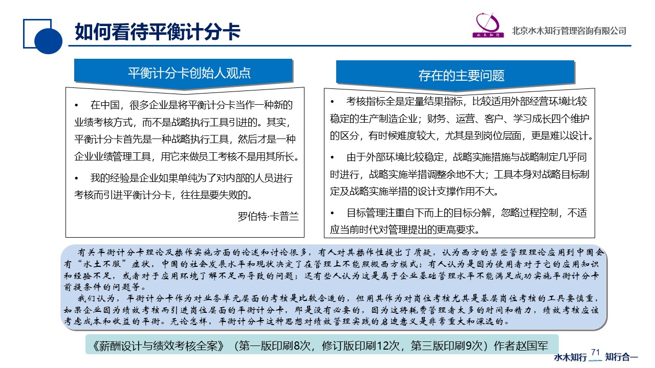 總體來講,平衡計分卡實質(zhì)是戰(zhàn)略管理工具,作為績效管理工作來講,他僅僅是選擇績效考核指標(biāo)的一種方法而已,其價值主要在于思想層面,在實操層面意義不大。首先,選擇績效考核指標(biāo)只是做好績效考核的基礎(chǔ),績效目標(biāo)如何確定,績效評價標(biāo)準(zhǔn)如何制定等更影響著績效考核的效度,決定了績效管理的成敗。其次,平衡計分卡如果應(yīng)用不當(dāng),會引起不良后果。作為工業(yè)經(jīng)濟時代的績效管理工具如果照搬應(yīng)用在知識經(jīng)濟時代,本身就脫離實際了。其次平衡計分卡過于追求定量考核,注重結(jié)果而忽略過程,只靠結(jié)果說話,這并不能滿足VUCA時代對管理提出的更高要求。因此生硬使用平衡計分卡,必然會帶來諸多問題。