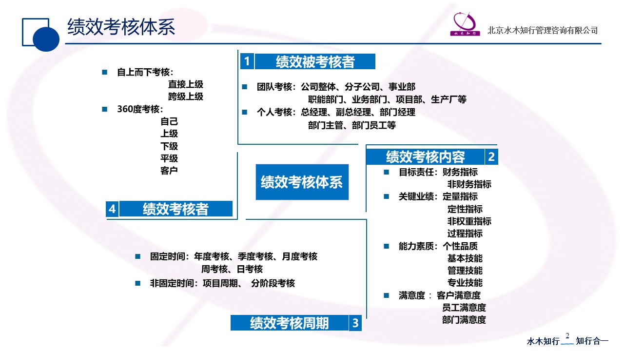 績(jī)效考核體系由績(jī)效考核者、績(jī)效被考核者、績(jī)效考核周期、績(jī)效考核內(nèi)容、績(jī)效考核結(jié)果等方面組成。