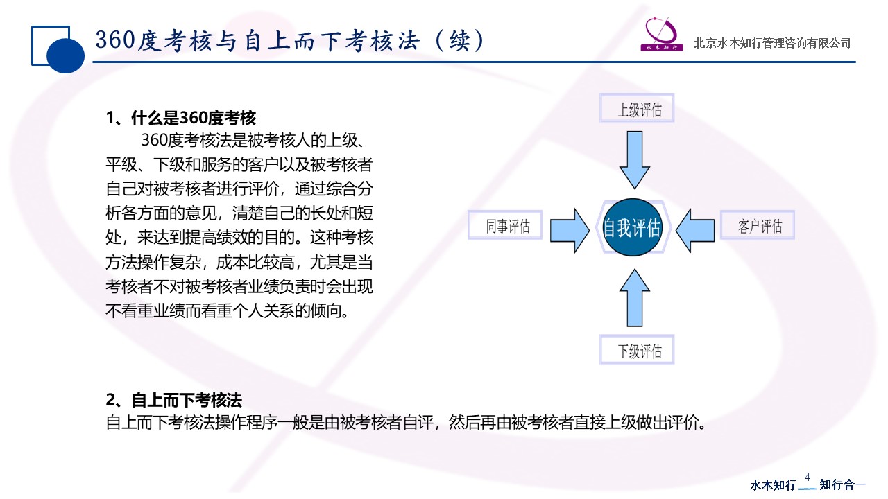 在企業(yè)實(shí)際運(yùn)作中,360度考核法和自上而下考核法是經(jīng)常采用的方法,通常針對(duì)考核內(nèi)容的不同,采取不同的方法或者兩種方法相結(jié)合。