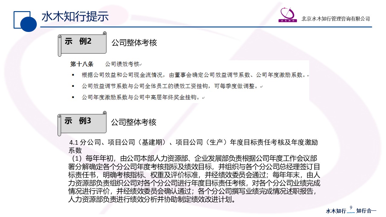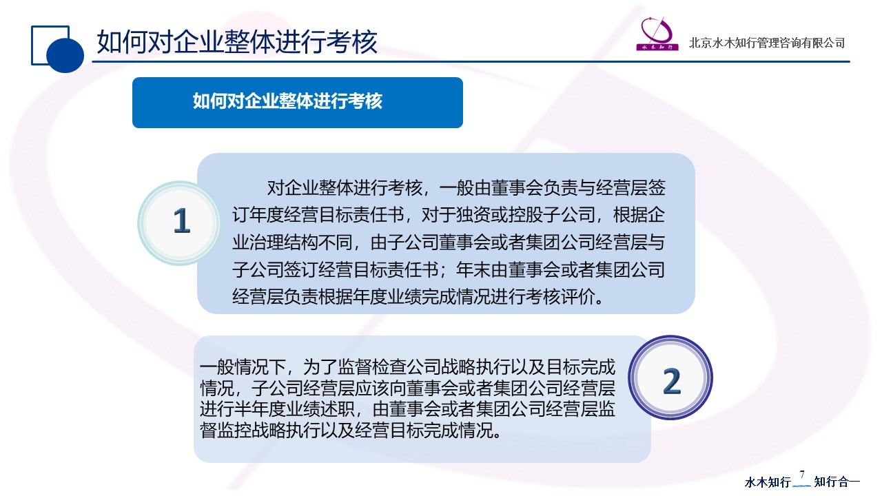 對公司整體進(jìn)行考核,一般由董事會負(fù)責(zé)組織與經(jīng)營層簽訂年度經(jīng)營目標(biāo)責(zé)任書,對于獨(dú)資或控股子公司,根據(jù)企業(yè)治理結(jié)構(gòu)不同,由子公司董事會或者集團(tuán)公司經(jīng)營層與子公司簽訂經(jīng)營目標(biāo)責(zé)任書;年末由董事會或者集團(tuán)公司經(jīng)營層負(fù)責(zé)組織根據(jù)年度業(yè)績完成情況進(jìn)行考核評價。