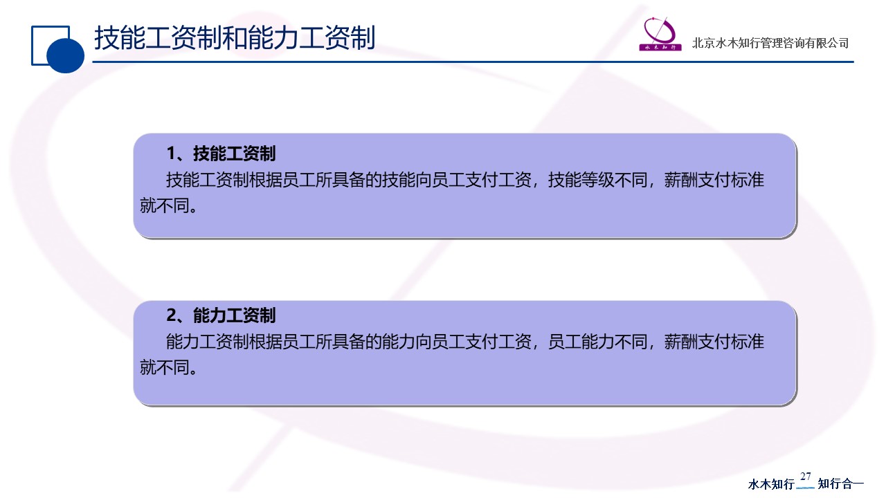 技能工資制和能力工資制是根據員工具備的與工作有關的技能和能力高低,來確定其報酬水平。技能工資制往往適用于普通崗位員工;能力工資制往往適用于中高級管理人員和專業(yè)技術人員。