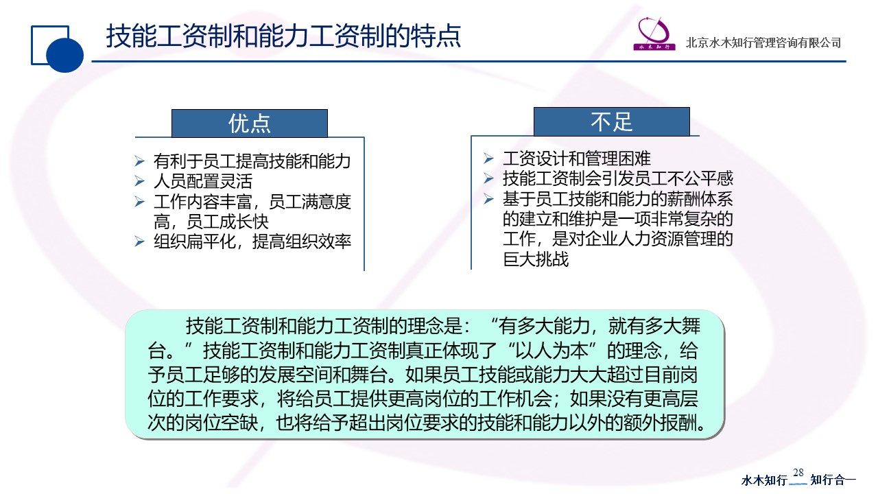②人員配置靈活。由于根據人的能力來確定工資,可以靈活配置員工,對于崗位輪換比較頻繁的企業(yè)有較大好處;由于人員任務分派不受崗位職責限制,更有利于將任務指派給合適的人去做;可以充分提倡“能者多勞”的精神,有利于進行人員精簡。