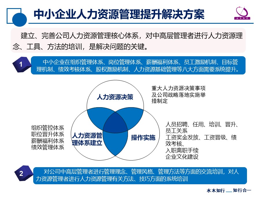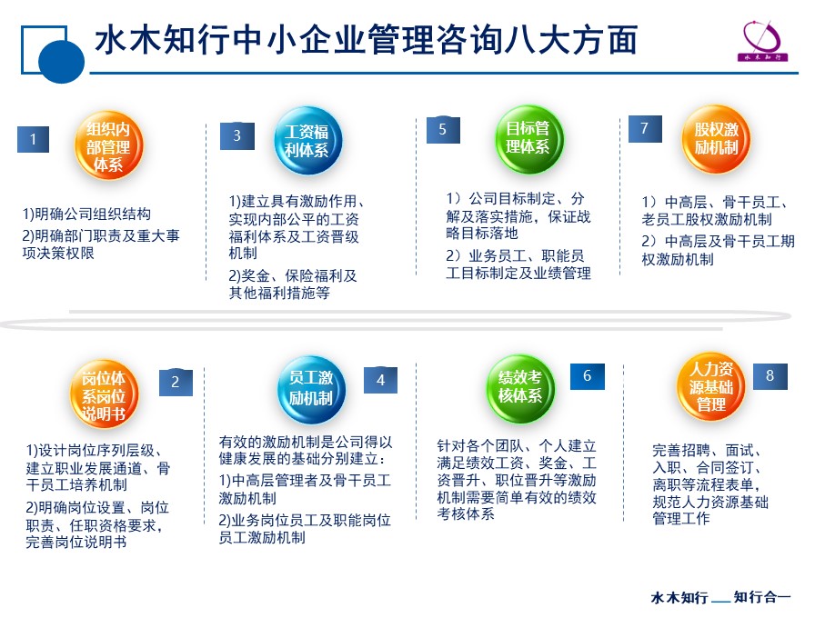 水木知行為中小企業(yè)提供組織結構與部門職責、崗位體系及崗位責權利、工資福利體系、員工激勵機制、目標管理體系、績效考核體系、股權激勵機制、人力資源基礎管理等八大方面的咨詢服務。