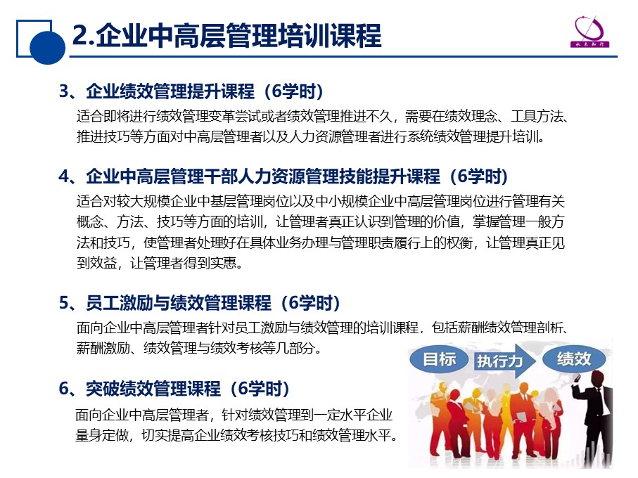 該課程(6學(xué)時(shí))是面向企業(yè)中高層管理者,針對(duì)績(jī)效管理到一定水平企業(yè)量身定做,切實(shí)提高企業(yè)績(jī)效考核技巧和績(jī)效管理水平。