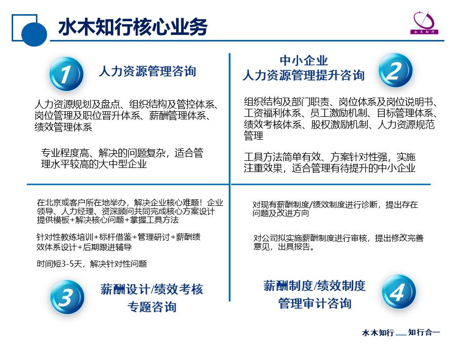 北京水木知行管理咨詢有限公司專注提供人力資源管理咨詢以及人力資源管理實戰(zhàn)培訓業(yè)務;北京水木知行管理咨詢公司(www.www.apevm.com)專注提供人力資源管理咨詢以及人力資源管理實戰(zhàn)培訓業(yè)務;為大中企業(yè)提供組織結構與管控體系、崗位管理與職位晉升體系、薪酬管理體系、績效管理體系四大領域的咨詢服務;為中小企業(yè)提供組織結構與部門職責、崗位體系及崗位責權利、工資福利體系、員工激勵機制、目標管理體系、績效考核體系、股權激勵機制、人力資源基礎管理等八大方面的咨詢服務。實戰(zhàn)咨詢培訓業(yè)務包括培訓形式包括訓練營、特訓班以及企業(yè)內(nèi)訓。